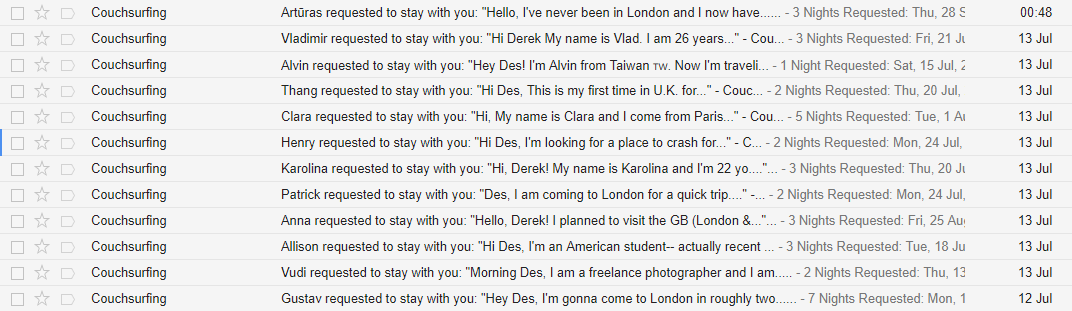 These are lame, but this is what the inbox of hosts in big cities (London, New York, etc.) looks like. We get ten requests a day: